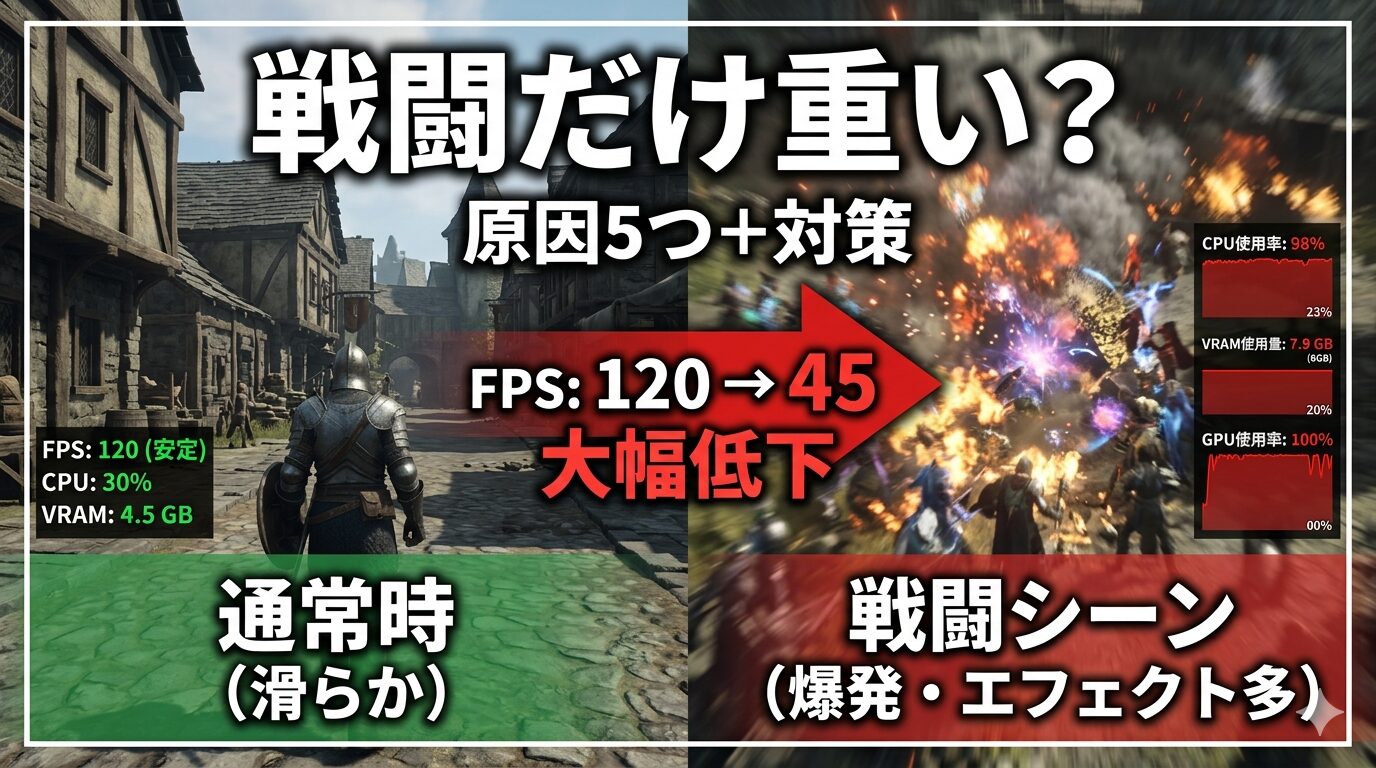 この記事では「戦闘時だけ重くなる理由」を原因別に数値で解説し、設定調整からパーツ交換まで段階的な対策をまとめます。
