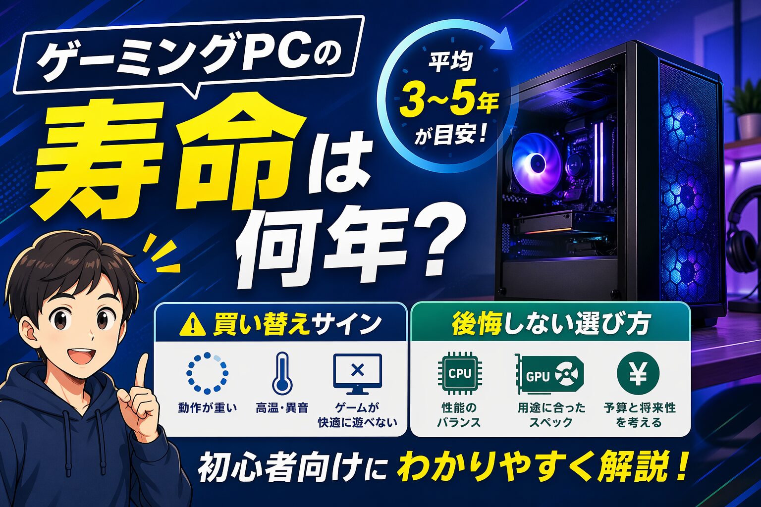 ゲーミングPCの寿命は、壊れるまでの年数だけでは判断できません。快適に遊べるか、遊びたいゲームの推奨スペックを満たせるか、修理費をかける価値があるかを合わせて考える必要があります。