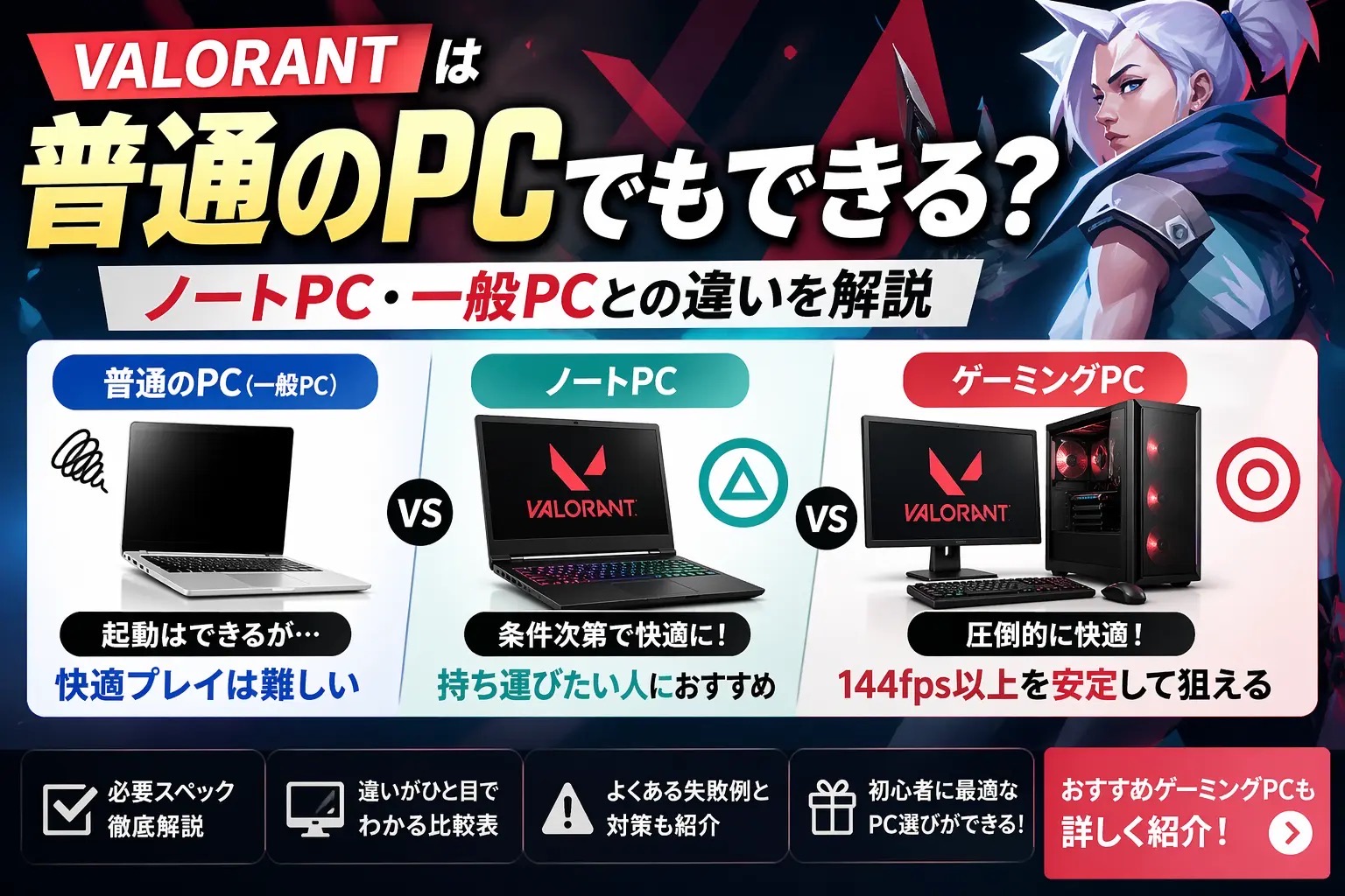 VALORANTは軽量タイトルとして有名ですが、「軽い=普通のPCで十分」は間違いです。カクつき・フリーズ・熱暴走・フレームレート不足でストレスが溜まり、勝負にすら参加できない状況になりがちです。この記事では、普通のPC・ノートPC・ゲーミングPCの違いをスペックで比較しながら、VALORANTを快適に遊ぶために本当に必要なものを初心者向けに解説します。